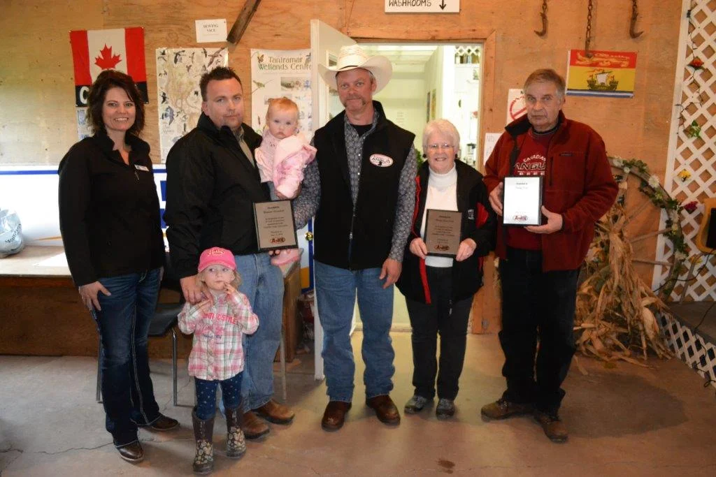 Left to right: Corinne Gibson, Canadian Angus Association president (Six Mile Red Angus, Fir Mountain, Sask.); Kurt, Kinley, and Karly Duncan, 25-year member (Duncan Livestock, Cornwall, P.E.I.); Trevor Welch, Maritime Angus Association director to the CAA Board and Past President of the Maritime Angus Association (Garvie Farms, Glassville, N.B.); Betty Lou Scott, 25-year member and 25-year Secretary-Treasurer Maritime Angus Association (WindCrest Farm, Mt Thom, N.S.); and Bill Scott accepting on behalf of Sandy Scott, 25-year member, also of WindCrest Farm. Dr. Bill Best of P.E.I. also qualified for a 25-year award but was unable to attend the Field Day in Port Elgin on June 13-14, 2014. (Photos by Emily Pipes)
